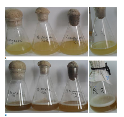 Early forty one strains belonging to different groups of microorganisms was screened. Majority of them expressed ability to synthesize nanoparticles to certain extent.8 Microorganisms from the culture collection of the Institute of Microbiology, isolated from mixed community of soil borne microorganisms exposed to long term impact of chemical production and from soil polluted with different xenobiotics were studied. Results of microbiological study of industrially important non-spore bacteria after long term storage revealed that they preserve high viability, but differ by sensitivity towards different pollutants. Screening for active strains resulted in selection of the most active microorganisms belonging to Pseudomonas genus (Table 1). It should be noted that representatives of this genus along with representatives of genus Bacillus in stress conditions support structures of microbial communities and according to literature available are active producers of silver nanoparticles.7–10 Strain Pseudomonas stutzeri, out of all studied Pseudomonas species, expressed the highest activity; it possessed high synthesizing capacity and, moreover, nanoparticles synthesized by this strain preserved stability up to two weeks and more (Figure 1). It is stipulated, possibly, by formation of smaller nanoparticles and by synthesis of compounds that coat nanoparticles thus preventing their aggregation and therefore stabilizing them. Difference in intensity of staining of different strains of Pseudomonas putida should also be noted. Possible reason may be the fact that Pseudomonas putida 2 was isolated from site polluted with heavy metals, whereas it is known that ability of microorganisms to form nanoparticles is a defensive function of the organism.7