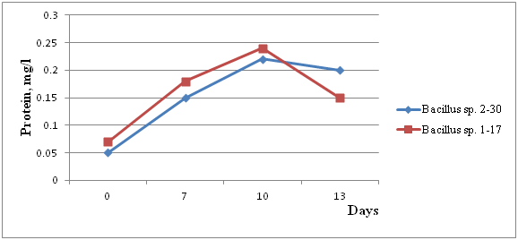 Out of studied soil samples the most often isolated species of bacteria were selected and received in pure cultures (multiple passages and analysis of growth of corresponding nutrient medium). As result, seven pure bacterial cultures were received. On basis of conducted study of morphological and cultural and physiological and biochemical features four of them were identified as Bacillus and three as Pseudomonas species. Despite of many literature sources, data on pesticides’ impact on soil borne microorganisms often contradictory. Different variations of suppression, activation and indifferent relation towards chemicals are determined among potentially possible reactions of soil borne microorganisms to pesticides’ presence in environment and in processes involving their participation. In these regards, experiments on impact of pesticides on growth and vital functions of microorganisms participating in their degradation were conducted. Analysis of growth and biochemical activity of sporogenous cultures at cultivation on synthetic medium revealed univocal activity in several times exceeding control indices, which testifies digestion of pesticides as the only source of energy. Besides, considering indices on protein synthesis, it is necessary to note increased protein content on 7th day of cultivation on synthetic medium, while maximal indices of protein biosynthesis are observed on 14th day (Figure 1). Therefore, such indices of biochemical activity testify ability of bacilli cultures to use pesticides as a source of nutrition. Conducted chemical analysis confirms suggested propositions. Degradation of pesticides for strain Bacillus sp. 2-30 reached 93.4%, whereas strain Bacillus sp. 1-17 degraded mixture of pesticides to 97% by 14th day.