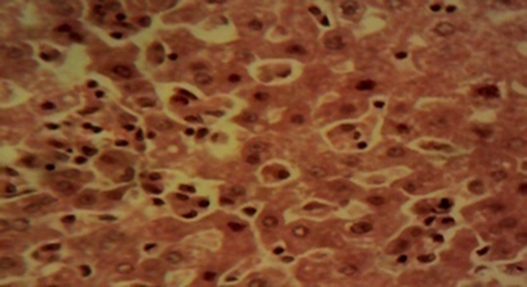 Figure 4 Photomicrograph of the liver of the MSG only animal showing mild to moderate diffuse, hepatocellular degeneration and necrosis involving all zones of the hepatic lobules (×400).