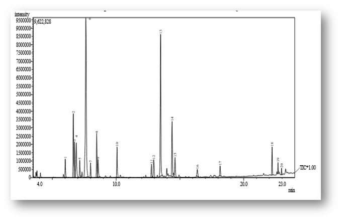 The essential oil was subjected to GC-MS analysis on a GC-MS instrument with Elite – DB- 5M column and the GC-MS solution version 2.53 software. Initially oven temperature was maintained at 60oC for 3.50 minutes, and the temperature was gradually increased up to 250oC at 10.0/24.0 min and 4.0 μl of sample was injected for analysis. Helium gas 99.995% of purity was used as a carrier gas as well as anfluent. The flow rate of helium gas was set to 0.99 ml/min. The sample injector temperature was maintained at 250ºC and the split ratio is 40 throughout the experiment periods. The ionization mass spectroscopic analysis was done with 70 eV. The mass spectra were recorded for the mass range 50-600 m/z for about 24 minutes. Identification of components was based on comparison of their mass spectra. As the compounds separated on elution through the column they were detected in electronic signals. As individual compounds eluted from the Gas chromatographic column, they entered the electron ionization detector where they were bombarded with a stream of electrons causing them to break apart into fragments. The fragments were actually charged ions with a certain mass. The m/z ratio obtained was calibrated from the graph obtained which was called as the mass spectrum graph which is the fingerprint of the molecule. The identification of compounds was based on the comparisons of their mass spectra with NIST Library 2008 WILEY8, FAME. Quantitative determinations were made by relating respective peak areas to TIC areas from the GC-MS (Purushoth, et. al., 2013; GCMS analysis, NARICT Zaria).