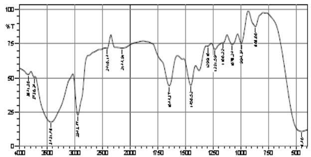 Characterization of the bioactive fraction of essential oils from Hyptissuaveolens(L. Poits) was carried out to determine the types of functional group(s) in the essential oils of Hyptissuaveolens fraction. The spectra reveal the presence of fifteen (15) functional groups (Table 4). The peak at 448.46, indicate the presence of a C-I stretch bond Alkyl halides of strong intensity and its derivatives group present. The peak at 1078.24, indicate the presence of a C-O stretch bond Alcohols of medium strong intensity and its derivatives. The peak at 1160.22 and 1299.1, indicate the presence of O=C-O-C stretch bond esters (aliphatic and aromatic compounds respectively) both having strong, very strong intensity. At the peak 1231.59, there is the presence of =C-O-C stretch bond ether of medium strong intensity. C-H bend is present at the peak 1450.52, Alkenes and Alkyls of strong intensity. At peak 1644.37, an indication of C=O stretch Amides is present with strong broad intensity. At the peaks 2943.47 and 3431.48, an indication of O-H stretch Carboxylic Acids are present with strong, broad intensity. At peaks 3736.24 and 3841.36, an indication of N-H symmetric bond of weak intensity is present. (Figure 2).