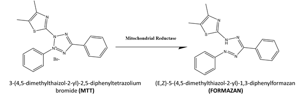 The potential cytotoxic effects of cathinones derivatives were screened in vitro in the human renal cells (Hk-2 cell line). Hk-2 is an immortalized cell line retaining functional and phenotypic characteristics of normal adult human proximal tubular epithelium, which is suitable for the study of nephrotoxic agents such as drugs of abuse.27 Hk-2 cells were exposed to different concentrations of cathinones for 24 h. Cell viability was indirectly evaluated through the assessment of mitochondrial function (MTT reduction assay) by reducing the tetrazolium salts. Briefly, in MTT reduction assay, yellow tetrazolium MTT is reduced by metabolically active cells (mitochondrial reductase enzymes) to generate reducing equivalents, such as NADH and NADPH. The resulting intracellular purple formazan can be solubilized and quantified by spectrophotometric means (550 and 690 nm) (Figure 2).