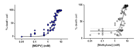 In this work, it was observed by the MTT assay, that both individual cathinone derivatives tested, induced cell death in a concentration-dependent manner. The data were obtained through five (MDPV) or six (methylone) independent experiments, using independently prepared serial dilutions of all tested compounds. The cytotoxicity dose-response curves for each of the tested drugs, including the upper and lower 95% CI, are displayed in Figure 3. Several parameters were determined, namely the EC50, the lower and upper limits of the curve, as well as the Hill Slope. Cathinones showed variable potencies according to their structure.