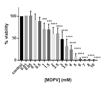 Figure 4 Effects of MDPV on MTT reduction in Hk-2 cells. Cells were exposed for 24 h, at 37 °C, to 0.01–10 mM MDPV concentrations. Results are presented as mean ± SEM from at least five independent experiments, performed in triplicate (***p < 0.001, ****p < 0.0001 versus control).