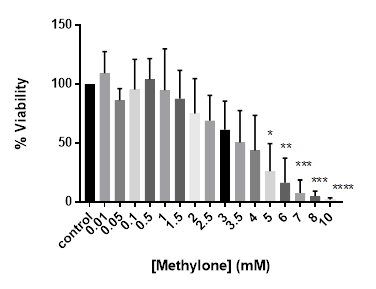 Figure 5 Effects of Methylone on MTT reduction in Hk-2 cells. Cells were exposed for 24 h, at 37 °C, to 0.01–10 mM methylone concentrations. Results are presented as mean ± SEM from at least six independent experiments, performed in triplicate (*p < 0.1, **p < 0.01, ***p < 0.001, ****p < 0.0001 versus control).