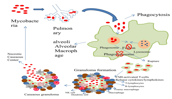 TB is transmitted in droplet aerosols and has waxy coat that protects it from drying out. Inhaled viable M. tuberculosis bacilli are internalized by alveolar macrophages and instead of forming phagolysosomes, the bacilli are protected in alveolar macrophages & undergo rapid replication. Active bacilli trigger a pro-inflammatory response which leads to the recruitment of neighboring lymphocytes & neutrophils, thus forming a cellular matrix of Granuloma. A lymphocytic cuff that is largely comprised of B and T cells characterizes the periphery of the granuloma, including neutrophils, foamy macrophages, dendritic cells & natural killer (NK) cells. Reactivation of infection occurs in the case where the core enclosing the bacilli breaks & releases infectious active M. tuberculosis into lungs airways