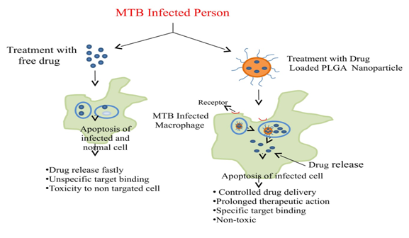 Macrophages are particularly effective in internalizing foreign particles & delivering the particles to the acidified endosomes. Drug loaded PLGA nanoparticles are internalized by M. tuberculosis infected macrophages and drug by is then to be released intracellulary into the macrophages to kill bacterium more effectively than an equivalent amount of free drug. Nanoparticle-mediated targeted delivery of therapeutic agents induces selective apoptosis of targeted cells without harming the normal cells. This would reduce treatment related side effects & enhance the quality of life in infected person.