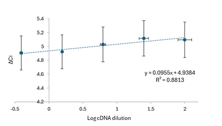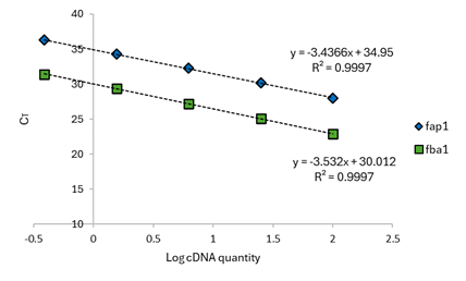 Validation was carried out to demonstrate that the experimental gene (fap1) and the endogenous gene (fba1) have similar or comparable amplification efficiency. A calibration curve was constructed for each gene in which both must have a slope around -3.32 ± 10%, confirming that the reaction efficiency falls within the acceptable range of 90-110%.12 Efficiency was calculated using Equation 1 which involves the slope of the calibration curve.13