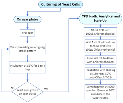 A small sample of a frozen stock of the yeast strain CFY7-PJ69-6A was grown on a YPD-agar plate and incubated at 32°C for 3-4 days.9 Subsequently, a single yeast colony was inoculated into 10.0 mL of YPD broth with 100 µL (34 mg/mL) Chloramphenicol and incubated with constant agitation (150 rpm) at 30°C.10 The cultured yeast was scaled up and grown until an OD600 0.7-0.9 was reached. Once the OD600 0.7-0.9 was reached, cultured yeast cells were centrifuged at 4000 rpm for 10 min at 30°C to obtain the yeast cell pellet. Figure 2 shows the steps required while culturing yeast cells.