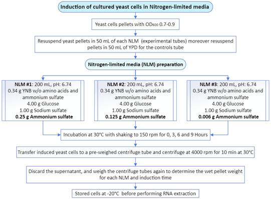 Figure 3 Induction conditions for the exposure of cultured yeast cells to a Nitrogen-limited media (NLM) that contains different amounts of Ammonium Sulfate.