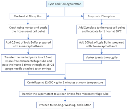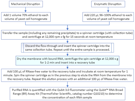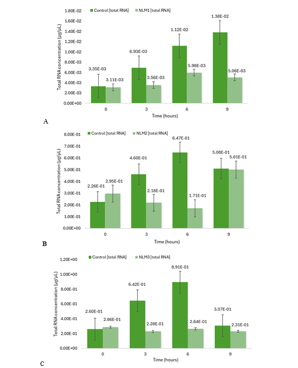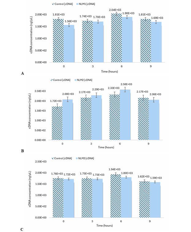Total RNA was extracted after a lysis reaction of each yeast pellet with the PureLink RNA Mini Kit Protocol (ThermoFisher Scientific, catalog number 12183018A). For the NLM1 samples and controls, the extraction was performed using mechanical disruption, involving the addition of 0.5 mL of Lysis Buffer, and following the steps according to Figure 5.3. Samples and controls from NLM2 and NLM3 were extracted using enzymatic disruption with Zymolyase (ZYMO RESEARCH, E1004/E1005) employing 10 µL of Zymolyase digestion buffer for samples below 0.1 g of yeast frozen pellet weight, while 20 µL of Zymolyase was used for samples over 0.1 g. Figure 4 shows the general steps required for total RNA extraction. After extracting the total RNA, the purification process was conducted using a series of washes and silica-membrane columns, following the steps outlined in Figure 5. Subsequently, the total RNA was transformed into cDNA by a reverse transcription (RT) reaction with the Applied Biosystems High-Capacity cDNA Reverse Transcription Kit Protocol (Fisher Scientific, catalog number 43-688-14). The conditions required for every amplification step using a thermal cycler machine are shown in Table 1. The concentration of each synthesized cDNA was determined using the Thermo Scientific™ NanoDrop™ Microvolume UV-Vis Spectrophotometer (Serie AZY2333437). Figure 6 shows the steps required for the preparation of cDNA.