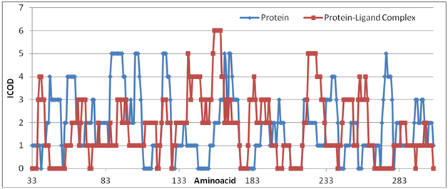 Another site at 208–216 is of interest for futuristic application of probe binding accordingly. Alternatively active region can also be suppressed at this site of interest. Another at 174–184 is fairly covered with existing probe. All other sites are already occupied by carbon domain value verifiable from blue line. Effective dark brown line of probe bound carbon domain graph for complex indicates the entire carbon deficient sites including 45–55 and 266–278 for further on binding force. Otherwise other site 208–216 is available in both bound and unbound state of protein. Engineering these sites is biologically important for futuristic application of carbon role of binding. Analysis of ICOD for the protein ligand interaction is one of the topics to be considered for treating diseases. There are analyses treating elemental level for drug discovery which again fails in accurate production. However ICOD analysis promisingly increases its strength day by day improving the future of molecular level interaction in the drug discovery platform. Every now and then there is adequate complex formation in the drug discovery profile. Very few leads to success in animal side of research for potential probe finding. Every drug discovery leading to potential probe for diseases are to be considered from bottom of ICOD analysis which are considered here as an address point for initiating probe finding. Every now and then there is going to be addressing probe analysis for securing active regions and the ligand bound state. Active regions are needlessly the binding domain of probe fixing which are demonstrated here again. Active regions are responding to the probe binding but adequately distant enough where all other forces are not influencing