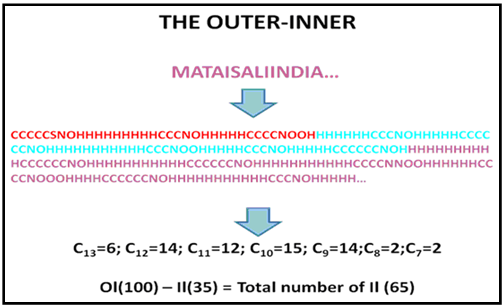 CARd analysis on the protein sequences are carried on using well known program called CARd. Details can be found at Pubmed of NIH.12 The flow diagram (Figure 1) outlines how the distribution of inner lengths based on carbon fraction is counted in an outer length. The pink coloured sequence protein sequence which is converted into atomic sequence (shown in multiple colours (red+blue+pink). The red portion is an inner length. The blue portion is outer length which includes the red portion as well. The entire atomic sequence is given in pink colour which includes both blue and red. Here the outer and inner lengths are taken as 100 and 35 atoms. There are 65 (100-35) inner lengths for statistics. These 65 inner lengths are grouped based on carbon fraction. The C11 has (11/35) 0.31 carbon fraction. The program named CARd has been written in PERL programming language to undertake this entire task. The program reads the protein sequence, converts into atomic sequence, takes a length (anything from 45 to 700 atoms) of sequence, divides into small lengths (of 33 to 350 atoms) of equal sizes, finds fraction of carbon atoms in all these small lengths and counts number of small lengths that contain a defined fraction of carbon. There are small lengths with 0.250/0.450 carbon but maximum at around 0.314. A distribution of range of small lengths based on carbon fraction appears like a normal distribution curve. This distribution curve is obtained for all possible outer length. The outer lengths can be any length within the range of length between 45 and 700 corresponds to 3 and 45 amino acids. Any outer length chosen between 100 and 250 atoms is sufficient for most of the observations. Here in modified version of CARd, it is selected as 62, 78, 109, 125,140, 155, 171, 202, 218, 233, 249, 264, 342 and 700 in our calculations. The inner length has been fixed at 35 atoms and can be anything between 33 and 350 which are not exceeding half of the outer length. Inner length of 35 atoms is chosen here in all our calculations as it is the smallest unit with 11 carbons which can produce fraction of 0.314 (close to standard of 0.3145). The outer length is moved with step value of selected atoms. Normally it can be half of the outer length. Here it is chosen as 7 atoms to capture carbon values at all amino acid location. A carbon distribution profile is obtained for all demonstrated outer lengths. So the carbon value obtained in terms of statistical valuation, namely mean, median, mode and standard deviation is graphed using XY plot. In fact it is only the median value taken as carbon faction at amino acid positions. Graph gives the idea of location of Globular Amphipathic Domain (GAD), carbon-high hydrophobic regions and reduced-carbon hydrophilic regions. If the values are close to 0.3145, then it is GAD, otherwise either carbon-high or reduced carbon portions depending on the hydrophobic values.