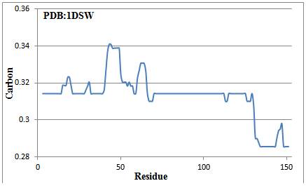The 153 amino acid long reference protein is subjected to GAD valuation. The calculated average median carbon values are plotted against residues (Figure 2). There is a long GAD region from 70 to 112 and after that. Similarly 1-14, 21-28, 32-39, 115-125 are GAD regions present in reference protein. There are carbon-high regions (for example 43-48) and a reduced-carbon region, 130-153. The GAD regions are hoped to be compact in nature, due to which the bond lengths are reduced. Fortunately, the NMR structure of this reference protein is available which has been checked for existence of carbon optimized domain (Figure 3). The result again confirms the presence of amphipathic domains. Infact it is internal carbon optimized domain (ICOD) based on structure that dominates the presence of amphipathic domains in sequence. Once again the variation of bond lengths confirms the presence of GAD, got obtained from sequence. These results based on structure will be put forth sometime again in detail. (Figure 4)