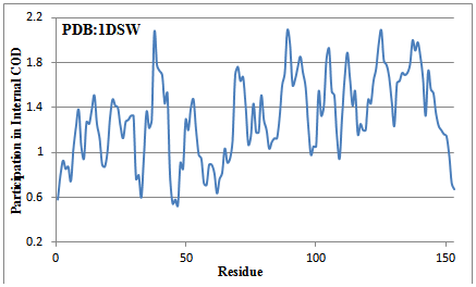 Figure 3 Participation of amino acid residues in icod for reference protein computed using pdb structure. Note that there is considerable amount of participation in ICOD at 70-112 and beyond that. Also note that there is reduction of participation in carbon-high regions at 15-20, 30-34 and 43-50. The carbon-high active region (62-64) is also less participation in ICOD.
