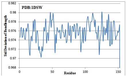 Figure 4 Average standard deviation of bond lengths of 5 back bone bonds(N-CA, CA-C, C-N, N-H and C=O) at each amino acid posistion. Note that the ICOD participating residues (70-112) have narrowed down its deviation considerably from standared of 1 and beyond variation occur that ICOD varying beyond residue number 112. Also note that carbon-high region 43-50 is showing less deviation than the other two hydrophobic regions 15-20 and 30-34. The carbon-high active region (62-64) is also in par with ICOD regions meaning that participating in ICOD in higher dias. The hydrophilic stretch 130-153 possess a variable standard deviation among the amino acid involved in. It is not a adduct unlike ICOD region but ICOD forming in.