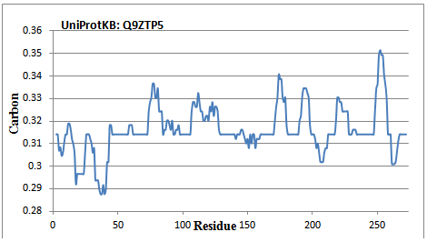 A 274 amino acid long ribulose-phosphate 3-epimerase protein is subjected to GAD evaluation of protein structure. The average carbon value is plotted (Figure 5) against residue. There are several ICOD stretches including 46-58, 62-73, 98-106, 129-139, 160-170, 181-189, 212-217, 234-247 and 267-272. The binding sites are observed to be the character of hydrophobic in nature. The reported (refer UniProtKB: Q9ZTP5 for detail) substrate binding sites (192-195 and 247-248) are hydrophobic regions that are being adjacent to ICOD portion. Similarly, 56, 114 and 227 are reported as binding site. Except 56, rests are in hydrophobic regions. The reported conflict regions (211-213 and 267-268) are due to the presence of adjacent reduced-carbon regions. It is observed that the transit region (1-39) reported as in Swissprot are in hydrophilic character.