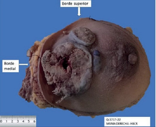 Figure 1 Macroscopic image: Mastectomy for right breast cancer, in a 33-year-old female patient. Gross description: Tumor of 10x8x6cm, multifocal, located in outer quadrants, protruding and ulcerating skin, with extensive necrosis.