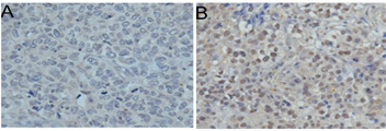Figure 2 Immunohistochemical expression of BRCA 1 in young women with breast cancer. (A) Negative nuclear expression, (B) Positive nuclear expression Jin-Tao Wei1 et al11