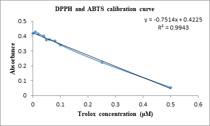 A calibration curve was performed with TROLOX (sigma-aldrich) with different concentrations ranging from zero to 0.5, in the three antioxidant capacity techniques and 1:10 dilutions of the extracts were prepared. The DPPH reagent was prepared by weighing 1.18 mg of DPPH and placing it in 50mL of ethanol. Subsequently, 190μL of the DPPH reagent and 10μL of the extract dilution were added to a microplate and allowed to stand for 30 min in the dark and finally read in a spectrometer at an absorbance of 517 nm. The percentage inhibition of the DPPH radical and ABTS was calculated using the equation shown below and the calibration curve shown in Figure 1.