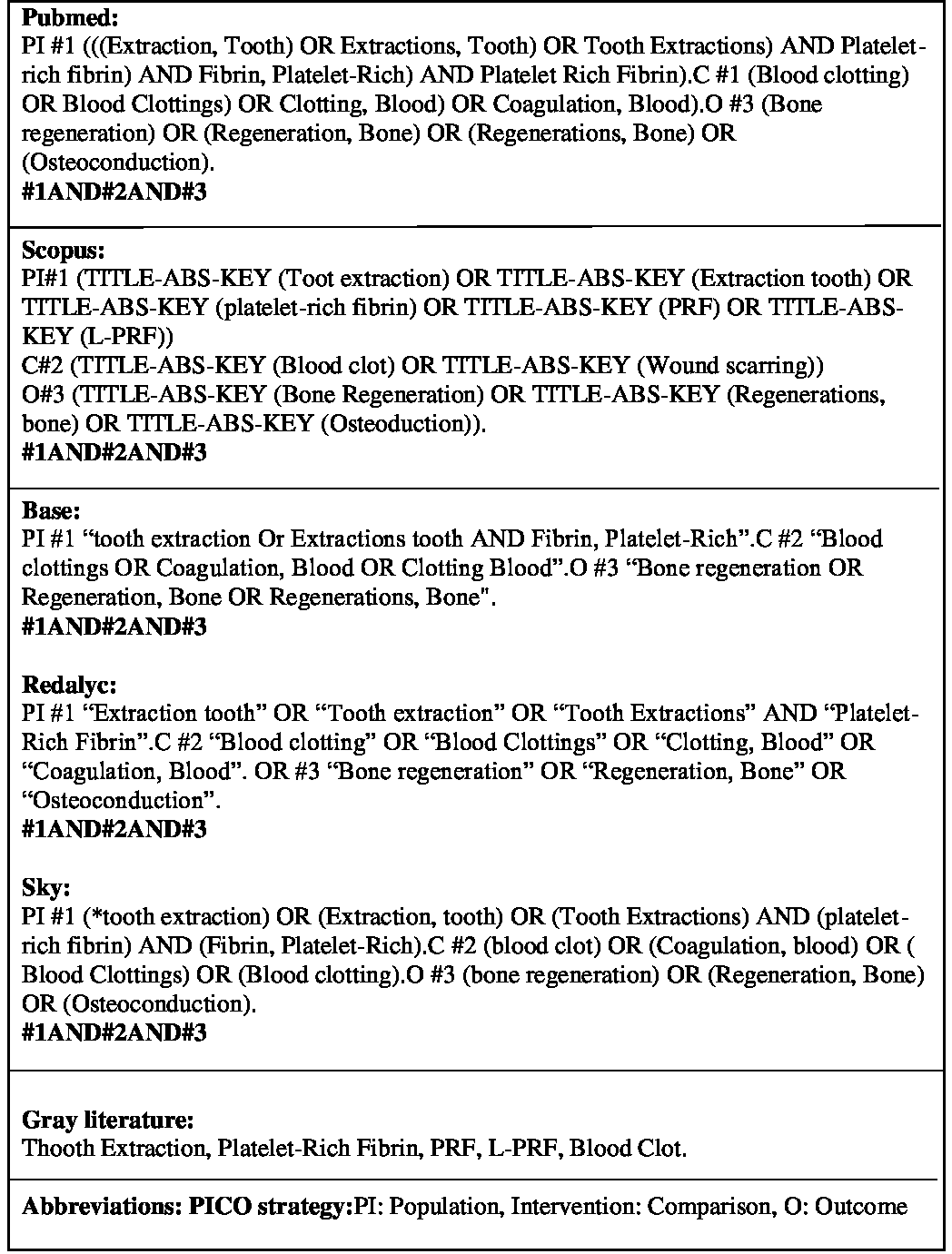 The search and collection of scientific articles from databases such as: PubMed, Scopus, Embase, Scielo, Redalyc and gray literature was performed, from which 220 articles within the last 8 years of publication (February 2015 to February 2023) were obtained. Controlled vocabulary was used (MesH terms from Pubmed, Emtree terms in Embase). The search strategy was performed using the keywords based on the PICO question section, separated by OR and AND operators. The following keywords were used as keywords: MesH terms: "Extraction, tooth" "Extractions, Tooth", "Tooth, Extractions", "Platelet-Rich Fibrin", "Fibrin, Platelet-Rich", "Blood, Clotting", "Blood, Clottings", "Clotting, Blood", "Coagulation, Blood", "Bone regeneration", "Regeneration, Bone", "Regenerations, Bone" "Osteoconduction". Emtree terms: "Extraction tooth", "Platelet-Rich Fibrin", "Blood clotting", "Bone regeneration". Free terms: "Tooth extraction", "Platelet-rich fibrin", "PRF", "Bone regeneration". Studies were included only in English and Spanish