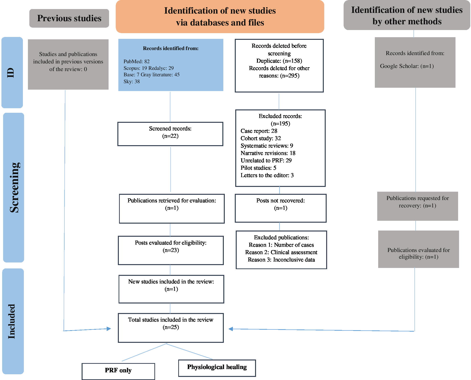 Materials and methods: the present descriptive, documentary, cross-sectional study was carried out following PRISMA 2020 standards, a search of 25 scientific articles of randomized controlled clinical trials with a minimum of 8 patients who needed dental extractions was carried out, who were divided into two groups, one test group containing platelet-rich fibrin and the other control group without platelet-rich fibrin, articles were collected from databases such as Google Scholar, PubMed, Scielo, Redalyc, Embase, which were within the last 8 years, articles that did not meet the objectives that served for this study were excluded.