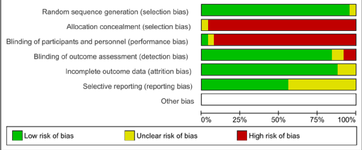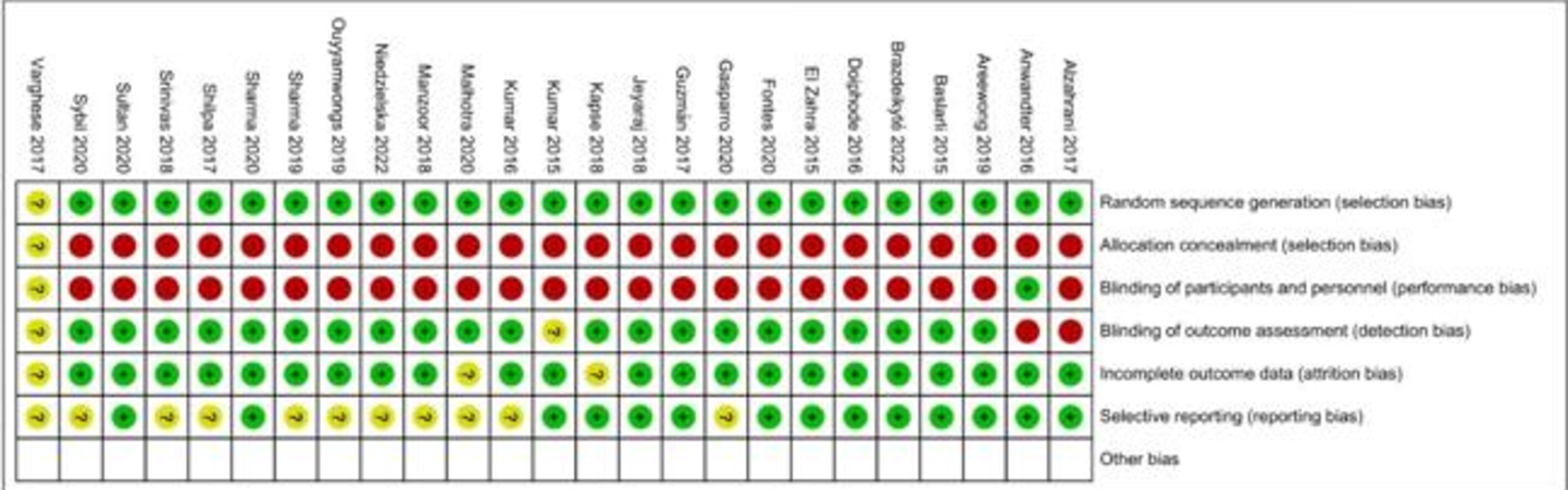 To determine the validity of the studies, they were grouped into 3 categories: low risk of bias, if the inclusion criteria were considered adequate; moderate risk of bias, if 1 or more study criteria were considered unclear; and high risk of bias if 1 or more study criteria were considered inadequate. The results of the risk of bias assessment are presented in Figure 2 & 3. All studies presented a moderate range of risk of bias (Figure 4).