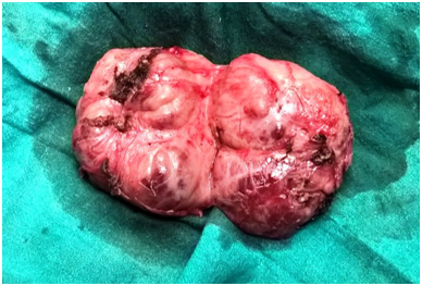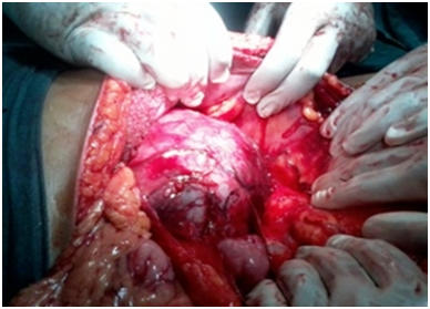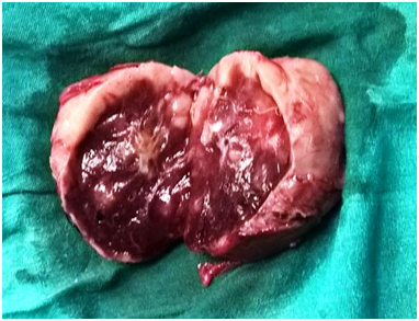 Laparotomy was undertaken for exploration by an upper midline incision. Per-operatively, a retroperitoneal mass was found inferior to the renal vein on the left side of aorta occupying 12th thoracic, 1st and 2nd lumbar vertebral levels. The tumor was situated left to abdominal aorta starting from the level of SMA extending to the level of lower pole kidney showing distinct planes with aorta, left ureter and SMA. Many direct arterial connections were seen supplying the mass from the aorta. The mass was found located anterior to the sympathetic and lymphatic chain. Intra-op BP varied from 220/120 to 100/50 due to catecholamine surge, which was managed successfully by anesthesia team. Meticulous hemostsis was achieved. The mass was completely respected. There were no significant perioperative and postoperative complications.