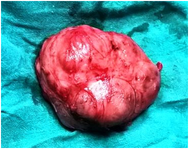 Ultrasonography showed a hypoechoic, round retroperitoneal mass suspected to be of mesenchymal origin measuring approx. 6.9x5.9cm in left paraaortic region anterior to left kidney with multiple anechoic cystic areas seen within the mass. CECT abdomen and pelvis was performed subsequently. There is evidence of large well marginated centrally necrotic enhancing mass situated left anterior to abdominal aorta starting from the level of SMA extending to the level of lower pole kidney showing distinct planes with aorta, left ureter and SMA.