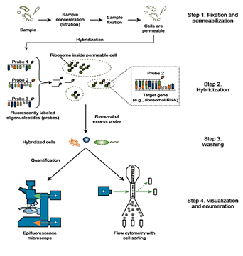 The procedure contains following basic steps (Figure 1). (i) Fixation and permibilzation of the specimens, (ii) hybridization of the probe with a target nucleotide, (iii) wash to remove unbound probes and (iv) visualization and enumeration of the result. However, in food microbiology, further steps for the sample preparation as homogenization, pre-enrichment procedures or bacterial separation might be necessary.4