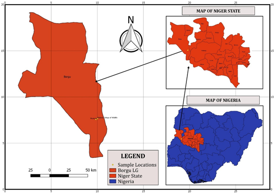 The study was carried out in Niger State, Nigeria. Nigeria is situated on the West Coast of Africa, lies on latitudes 9.0820°N of the Equator and latitudes 8.6753°E of the Greenwich Meridian.14 Nigeria shares boundaries with The Republics of Benin and Niger in the West, Cameroon in the East, Niger and Chad in the North and the Gulf of Guinea in the South. Nigeria has an area of 923,768.64km2 (Figure 1).