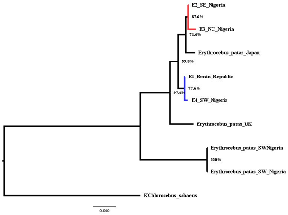 Phylogenetic tree is based on the COI sequences of 9 individuals from different locations. The newly sequenced individual E1 and E4 are from Benin Republic and South West Nigeria and E2 and E3 from North Central, Nigeria, West Africa (Table 2). Others were downloaded from the National Center for Biotechnology Information (NCBI) (Table 2). To validate the reliability of the sequence, comparison was made with other mitochondrial sequences from Erythrocebus species. The phylogenetic position was estimated from complete mtDNA sequences. The phylogenetic placement (Figure 2) shows that the individuals consist of two major groups with six clades (A-F). Clade consists of a monophyletic group of species that shows single common ancestors. Each pair consists of a clade which reveals their closeness or relatedness, that is, they share a recent common ancestor. However, they all share a common ancient ancestors which serve as an outgroup (clade F).