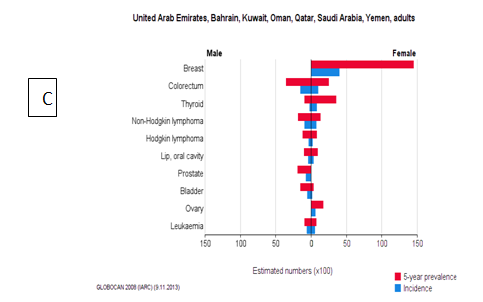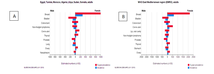 For the prevalence of cancers and in order to determine the 5-top cancers among Arabian populations, the WHO Online-Software data were used to conduct statistical analysis. The sets of the analysis were selected for the 3 clusters (as designed above) of the Arabian populations for both males and females cancers as compared worldwide.