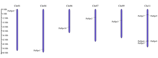 Figure 1 Distribution of PaHrp genes across chromosomes. The scale represents megabases (Mb). Chromosome numbers are indicated above each vertical bar.