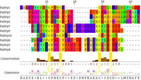 Figure 2 Multiple alignment of PaHrps demonstrating low sequence conservation, but revealing the conserved cysteines characteristic of α-hairpinins.