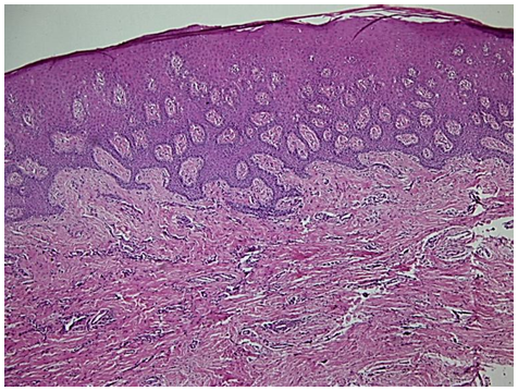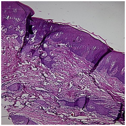 Results: Epithelium showed stratified squamous para-keratinization with focal epithelial hyperplasia entrapped with connective tissue. The connective tissue was moderately fibrous with focal areas of cellularity showing plum fibroblasts and fibrocytes.