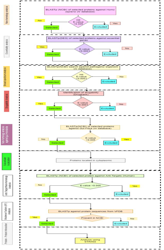 The broad-spectrum analysis is one of the important criteria for multiple infections caused by a broad spectrum of bacterial pathogens. The step is to analyze the bacterial pathogens in broad- spectrum proteins target which can be beneficial for developing drug target for antimicrobial-resistant pathogens.10 The bacterial proteins are subjected to BLASTp with e-value of 0.005 against a wide-range of bacterial proteomes.14