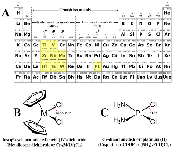 Figure 1 Transition metals as central atoms in antitumor agents. Some early and late transition metals (highlighted in yellow color) are known (A) to form Cp2M(IV)Cl2 and cisplatin, respectively. General representation of the molecular structure of a metallocene dichloride (B), where the angle M(Cl–M–Cl)=Ti+4 (94.6°),37 V+4 (87.1°),38 Mo+4 (81.3°/82.0°),39,40 Nb+4 (85.7°),39 Zr+4 (97.2°),39 W+4 (81.5°)41 and Hf+4 (98.0°).40 The molecular structure of cisplatin (C),where the Cl-Pt-Cl angle is 91.9°.42,43