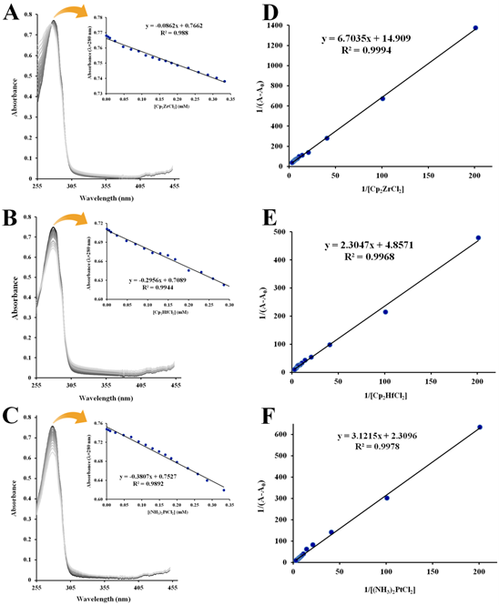 Figures 3, 4 and S2 show the linear double reciprocal plots of 1/(A–A0) vs 1/[Cp2M(IV)Cl2]. In summary, Ka was obtained for all metallocene dichlorides at 280 nm, but at 361 nm, it was only obtained for Cp2VCl2, Cp2MoCl2 and Cp2WCl2 (Table 2). At 280 nm, the Ka for Cp2VCl2 (Figure 3D), Cp2MoCl2 (Figure 3E) and Cp2WCl2 (Figure 3F) was 3.24×103 M–1, 3.06×103 M–1 and 2.93×103 M–1, respectively. Meanwhile at 361 nm, their Ka was 2.67×103 M–1, 3.09×103 M–1 and 2.98×103 M–1, respectively. For Cp2NbCl2 (Figure 4C) and Cp2TiCl2 (Figure 4D), the Ka(at 280 nm) was 3.00×103 M–1 and 2.89×103 M–1, respectively. In addition, Cp2ZrCl2 (Figure S2A), Cp2HfCl2 (Figure S2B) and (NH3)2Pt(II)Cl2 (Figure S2C) have a Ka (at 280 nm) of 2.22×103 M–1, 2.11×103 M–1 and 7.4×102 M–1, respectively. In general, all these Ka were found moderately large, in an order of magnitude of 103. However, the Ka for (NH3)2Pt(II)Cl2 was considerably small, in an order of magnitude of 102.