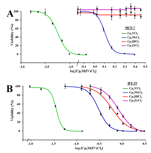 Figure 2 Dose-response curves of four metallocene dichlorides after their exposure for 72 h on two human breast cancer MCF-7 (A) and colon cancer HT-29 (B) cell lines.