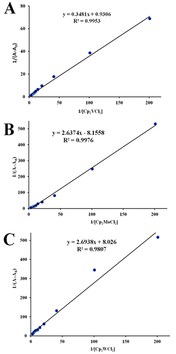 Figure S2 Double reciprocal plots (1/(A–A0) vs 1/[Cp2M(IV)Cl2]) of the Benesi and Hildebrand equation for Cp2VCl2 (A), Cp2MoCl2 (B) and Cp2WCl2 (C) were generated at361 nm.