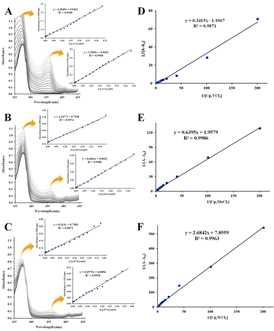 Figure 3 UV-Vis absorption spectra (T=298 K, pH=7.4) of 1.0×10–5 M apo-hTf in the presence of Cp2VCl2 (A), Cp2MoCl2 (B) and Cp2WCl2 (C). The insets show linear plot of absorbance vs [Cp2M(IV)Cl2] generated at 280 nm and 361 nm. Double reciprocal plots (1/(A–A0) vs 1/[Cp2M(IV)Cl2]) of the Benesi and Hildebrand equation for Cp2VCl2 (D), Cp2MoCl2 (E) and Cp2WCl2 (F) were generated at280 nm.