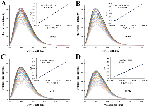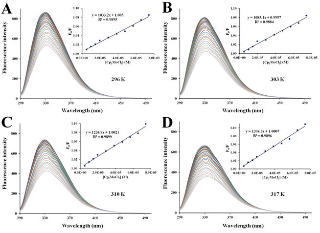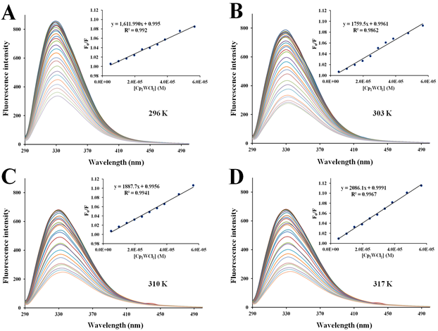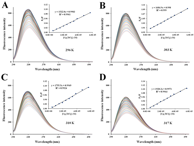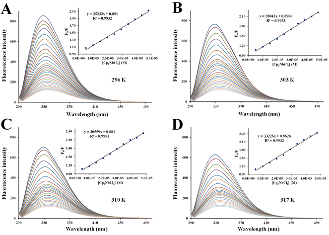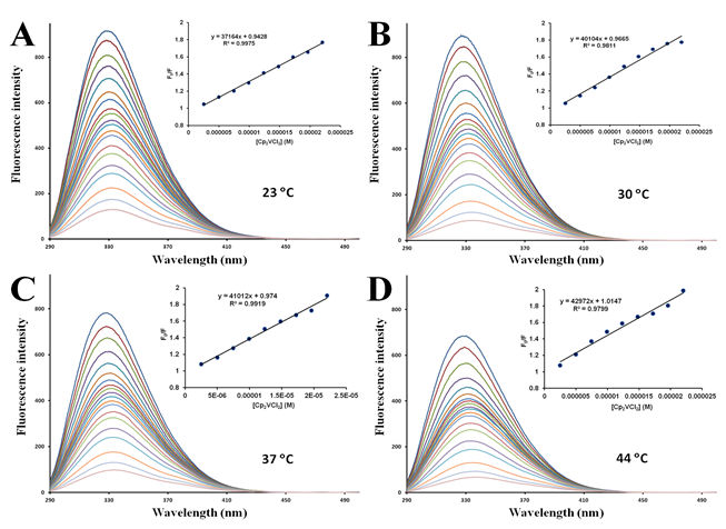 The absorption spectra of apo-hTf exhibited a strong absorption band at 280 nm characteristic of the π→π* transition of the aromatic amino acid residues Trp, Tyr and Phe.93 This band at 280 nm increases as the concentration of Cp2M(IV)Cl2 (M(IV) =V, Mo, W, Nb and Ti) increases as shown in Figures 3A, 3B, 3C, 4A and 4B, respectively. In addition to this hyperchromic effect, a slight red shift was also observed. These spectral changes might suggest that an interaction between apo-hTf and these metallocene dichlorides has occurred through a static quenching. A change in λmax might be due to loosening and unfolding of the protein backbone. As a result, more changes in polarity around the Trp and/or Tyr microenvironment could occur due to changes in the secondary structure of apo-hTf and, hence, changes in hydrophobicity around these aromatic residues.94,95 However, when Cp2VCl2, Cp2MoCl2, and Cp2WCl2 were added to apo-hTf, a broad new band appeared immediately at 361 nm and its intensity also increased with increasing amounts of these three compounds (Figures 3A,3B,3C, respectively). An equal effect was also observed with Cp2TiCl2, but the broadband appeared immediately around 340 nm (Figure 4B). This new band is similar to those observed for ligand to metal charge transfer (LMCT) transitions of metal(IV) with phenolate residues, and suggest to be attributed to the LMCT transition of MIV with phenolate residues.63 On the other hand, when Cp2HfCl2, Cp2ZrCl2 and (NH3)2Pt(II)Cl2 were added to apo-hTf, the absorption band at 280 nm decreases with increasing concentration of these compounds, as can be seen in Figures S1A, S1B, and S1C, respectively. The results suggest a poor interaction between apo-hTf and these three compounds. The observed changes in absorbance readings of apo-hTf (in the presence of different concentrations of metallocene dichlorides) could suggest the occurrence of dynamic quenching interaction between Cp2HfCl2(or Cp2ZrCl2 or (NH3)2Pt(II)Cl2) and apo-hTf.80