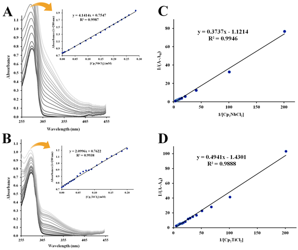 Figure 4 UV-Vis absorption spectra (T=298 K, pH=7.4) of 1.0×10–5 M apo-hTf in the presence of Cp2NbCl2 (A) and Cp2TiCl2 (B). The inset shows linear plot of absorbance vs [Cp2M(IV)Cl2] at 280 nm. Double reciprocals plots (1/(A–A0) vs 1/[ Cp2M(IV)Cl2]) of the Benesi and Hildebrand equation for Cp2NbCl2 (C) and Cp2TiCl2 (D) were generated at280 nm.