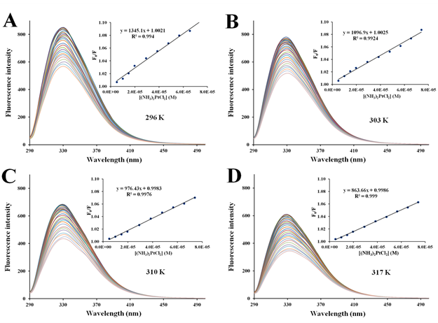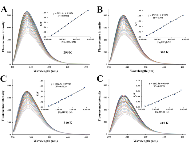 Fluorescence spectra of apo-hTf and apo-hTf:Cp2M(IV)Cl2 complexes were recorded in a Shimadzu RF-5301 PC spectrofluorophotometer equipped with a 150 W xenon lamp and temperature controller. All apo-hTf:Cp2M(IV)Cl2 complexes were prepared in a 1.0 cm quartz cuvette and analyzed using an emission wavelength range from 290 nm to 500 nm, excitation wavelength of 280 nm, excitation width of 10 nm and emission width of 5 nm. The emission spectra were also recorded at 296 K, 303 K, 310 K and 317 K to observe the stability of complex formation with changes in temperature. The quantitative analysis was performed by fluorometric titration. One milliliter of 1.0×10-5 mol L–1 apo-hTf in 20 mM Tris-HCl buffer at pH 7.4 was titrated with different amounts of 1.0×10-3 mol L–1 Cp2M(IV)Cl2 (5, 10, 15, 20, 25, 50, 75, 100, 125, 150, 175, 200, 250, 300, 350 and 400 mL) and at the different temperatures. All titrations were performed in triplicate.65 Fluorescence intensities of the quenching spectra were corrected on absorbances at the excitation and emission wavelengths to decrease the inner filter effect, according to the following equation: