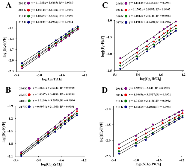 All the results were expressed as means ± standard deviation (SD). The cytotoxicity of metallocene dichlorides against MCF-7 and HT-29 was expressed as IC50±SD and determined using GraphPad Prism, while cell viability vs log [Cp2M(IV)Cl2] plot was fitted to obtained the sigmoidal dose-response curves. UV-Vis absorption (at 280 nm and 360 nm) and fluorescence intensity (at 330 nm) data were plotted against [Cp2M(IV)Cl2] using linear regression analysis, and coefficient of determination (R2) were reported as statistical measure that indicates the linear relationship between the evaluated variables. Binding constants and thermodynamic parameters were determined using different linear regression fit.