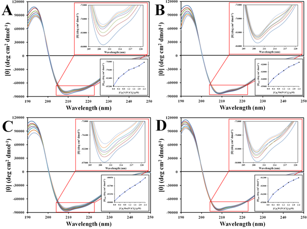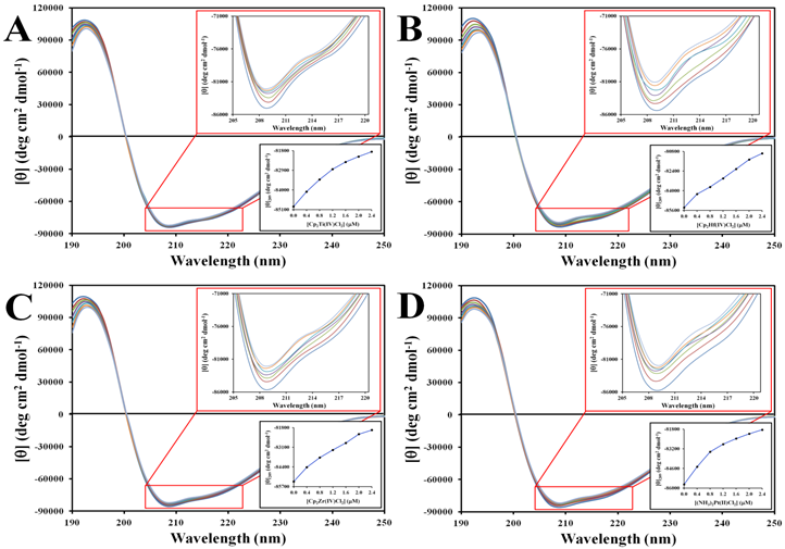 Circular dichroism (CD) was used to find changes in the secondary structure of apo-hTf upon interaction with Cp2M(IV)Cl2 using far-UV (from 190 nm to 250 nm) and near-UV (from 250 nm to 300 nm) regions. CD spectra were carried out on a Jasco J-815 CD spectropolarimeter, equipped with a xenon lamp monochromatic linearly polarized. All CD measurements were done under a constant Nitrogen flow and using a 1.0 cm quartz cuvette. (+)-10-Camphorsulfonic acid was used for calibration of the spectropolarimeter following the manufacturer instructions. Six scans were accumulated and the spectral data was recorded in the range from 190 nm to 300 nm, with a scan speed of 100 nm/min. A volume of 2.5 mL of 4.0×10−7 mol L–1 apo-hTf in 2 mM Tris-HCl buffer at pH 7.4 was titrated with different amounts of 1.0×10−3 mol L–1 Cp2M(IV)Cl2 (0, 1, 2, 3, 4, 5 and 6 mL). The final concentration of Cp2M(IV)Cl2 varied from 0.0 mol L−1 to 2.4×10−6 mol L−1. The baseline was run using 2 mM Tris-HCl buffer at pH 7.4, either alone or with equal amount of DMSO at room temperature.68