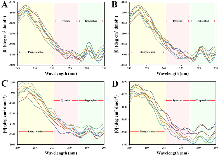 Near-UV CD spectrum of native apo-hTf (from 250 nm to 300 nm) shows different bands due to the aromatic amino acid residues within the protein. This spectral range also gives information on short-range interactions of the aromatic side chains of apo-hTf with other optically active groups of the protein, including other aromatic side chains.96 Changes in position or interactions among the aromatic groups may imply changes in CD spectra recorded in the range of 250 nm to 300 nm. Signals at a wavelength range from 250 nm to 270 nm are attributed to phenylalanine, from 270 nm to 290 nm are attributed to tyrosine, and those from 290 nm to 300 nm are attributed to tryptophan.105 These bands regularly decrease or increase with increasing concentration of metallocene dichloride, suggesting that the interaction apo-hTf with these compounds partially disrupts the anisotropic environment of the aromatic residues (Figure 12 & Figure S12).