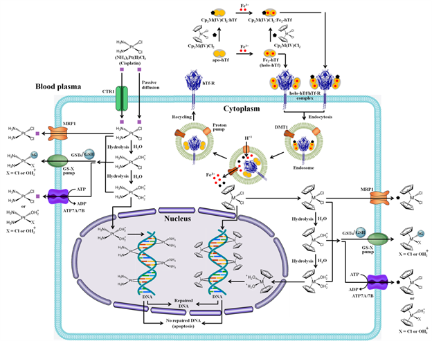 Figure 13 Proposed molecular mechanismof action for metallocene dichlorides (Cp2M(IV)Cl2) associated to the hTf:hTf-Rcomplex and for cisplatin ((NH3)2Pt(II)Cl2).Abbreviations: CTR1 (chloride transport receptor 1); GSH (glutathione); GSTs (glutathione S-transferase); MRP1 (multidrug resistance-associated protein 1); GS-X pump (ATP-dependent glutathione S-conjugate export pump); ATP7A/7B (copper transporters ATPase copper-transporting alpha (ATP7A) and ATPase copper-transporting beta (ATP7B)).