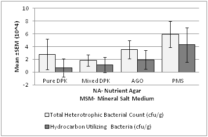 The physicochemical parameters are show in Table 1. The pH of pure dual purpose kerosene (DPK) is slightly higher (6.7) than that of premium motor spirit(PMS), automobile oil and gas (AGO), and mixed dual purpose kerosene (DPK) which are 6.60, 6.50, and 6.60 respectively. The conductivity of pure DPK is higher (32.50mhos/cm) compared to the PMS, AGO and Mixed DPK. The moisture content of pure DPK was more with 14.50% while that of PMA AGO, and Mixed DPK were 10.20%, 10.80% and 10.20% respectively. Total Carbon content was higher in AGO (4.75%) compared to PMS, Mixed DPK and Pure DPK which have 2.19%, 1.38% and 2.97% respectively. Total organic matter, Nitrogen and Phosphate (8.19%, 0.95% and 5.52% respectively) were also higher in AGO. The total heterotrophic bacteria were higher in nutrient agar plates than in MSM which was spread with 0.1ml of petroleum products. The total heterotrophic bacteria count is shown in Table 2 & Table 3. The population density of heterotrophic bacteria in soil sample contaminated with PMS was 5.93×104 ±0.20 which was highest compared to the soil contaminated with AGO, pure DPK and mixed DPK with population densities of 3.53×104 ±0.15, 2.77x104 ± 0.24 and 1.83x104±0.09 respectively.13-17
